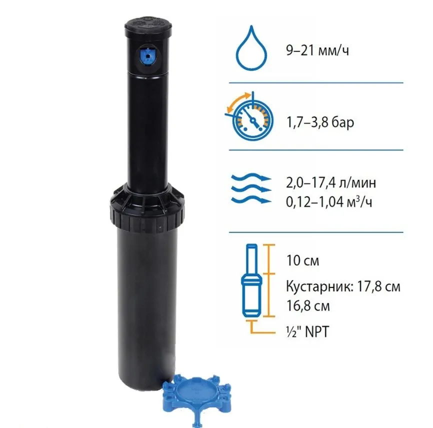 Сектор полива: 40 - 360º Радиус полива: 4.6 - 10.7 м Радиус можно уменьшить до 2,9 м с помощью регулировочного винта Кол–во сопел в комплекте: 6 Высота выдвижной штанги: 10 см Общая высота: 18 см Резьба подключения: внутренняя резьба 1/2" Расход воды: 0,12 - 1,04 м3/ч Давление: 1,7 - 3,8 бар